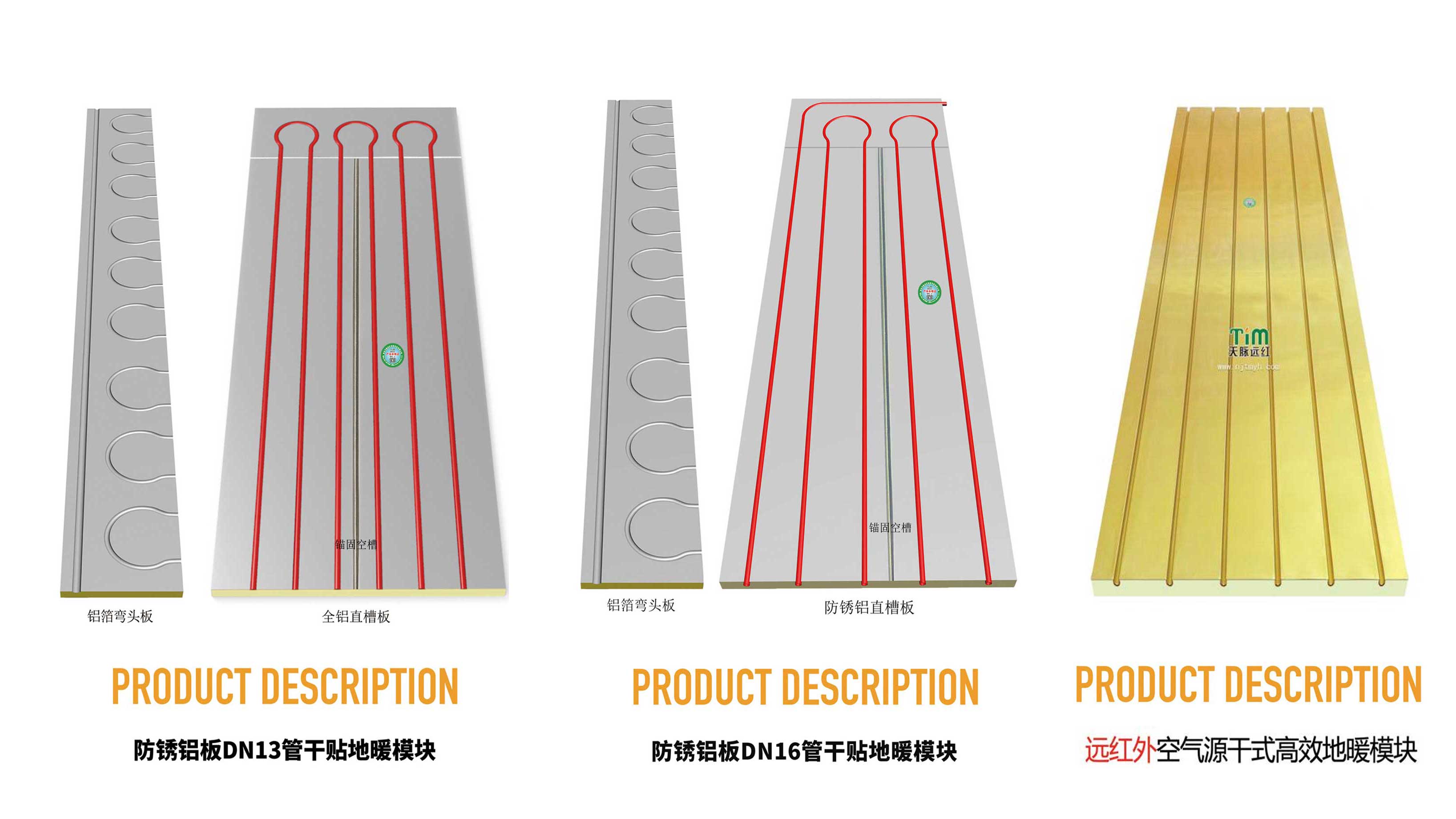 公司產品包括全鋁板環保干式水/電地暖模塊系列、遠紅外干式地暖模塊系列、空氣源熱泵高效末端系列、老房快裝地暖系列、汗蒸房墻暖系列。產品入選《百年中國》科技匯編,被中國建筑裝飾裝修材料協會認定為中國綠色、節能、環保建材產品。